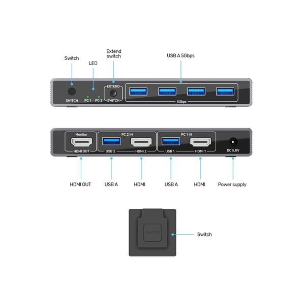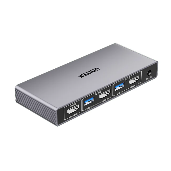 The UNITEK 5Gbps HDMI KVM Switch lets you control two computers with one monitor and share up to four USB 3.0 devices, allowing effortless switching with a button press.